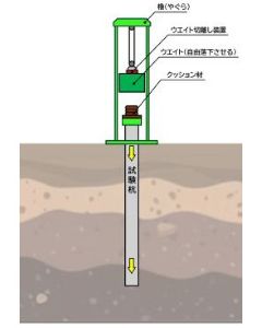 急速載荷試験の中で現在多くの実績がある方法の一つとして、柔らかいクッションを用いて,重錘の落下の打撃力を急速荷重に変換し載荷する軟クッション重錘落下方式があります。載荷時間が比較的遅いため(0.1~0.2秒程度)、載荷中杭は全圧縮の状態にあり、杭の静的な荷重-変位関係についてもある程度評価することができます。さらに地震時挙動の把握を目的とした調査には適切です。