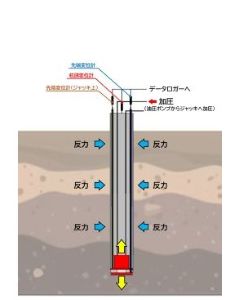 先端載荷試験は、あらかじめ杭先端にジャッキを埋設して、杭先端に荷重をかける試験です。杭の摩擦抵抗と先端抵抗とをお互いに反力として、載荷するものです。大規模な反力梁を必要とせずに、杭先端に大きな力をかけることができるため、比較的低コストな実験を行うことができます。杭の荷重-変位関係をダイレクトに求めることはできませんが、 実験結果をもとにした解析(荷重伝達法等)を行うことで、精度の良い推定が可能です。