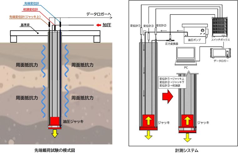 杭先端載荷試験は、杭の先端にあらかじめ取り付けた油圧ジャッキによって、先端抵抗と周面摩擦抵抗とを互いに反力として載荷する方式の載荷試験です。この方法では反力杭や載荷梁などの反力装置が不要となり、安全かつ工期短縮が可能で低コストであること、杭先端に直接荷重を載荷できるため精度の良い支持力特性の把握が可能となるなどのメリットがあります。載荷装置には、アメリカ・オスターバーグ教授が実用化した先端ジャッキ方式や、千代田化工建設が実用化した新載荷試験法があります。