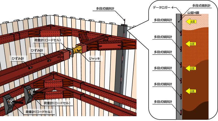 弊社では、多段式傾斜計・ひずみ計・荷重計(ロードセル)などを用い、山留め壁の変位、部材応力、切梁軸力を高精度に計測します。